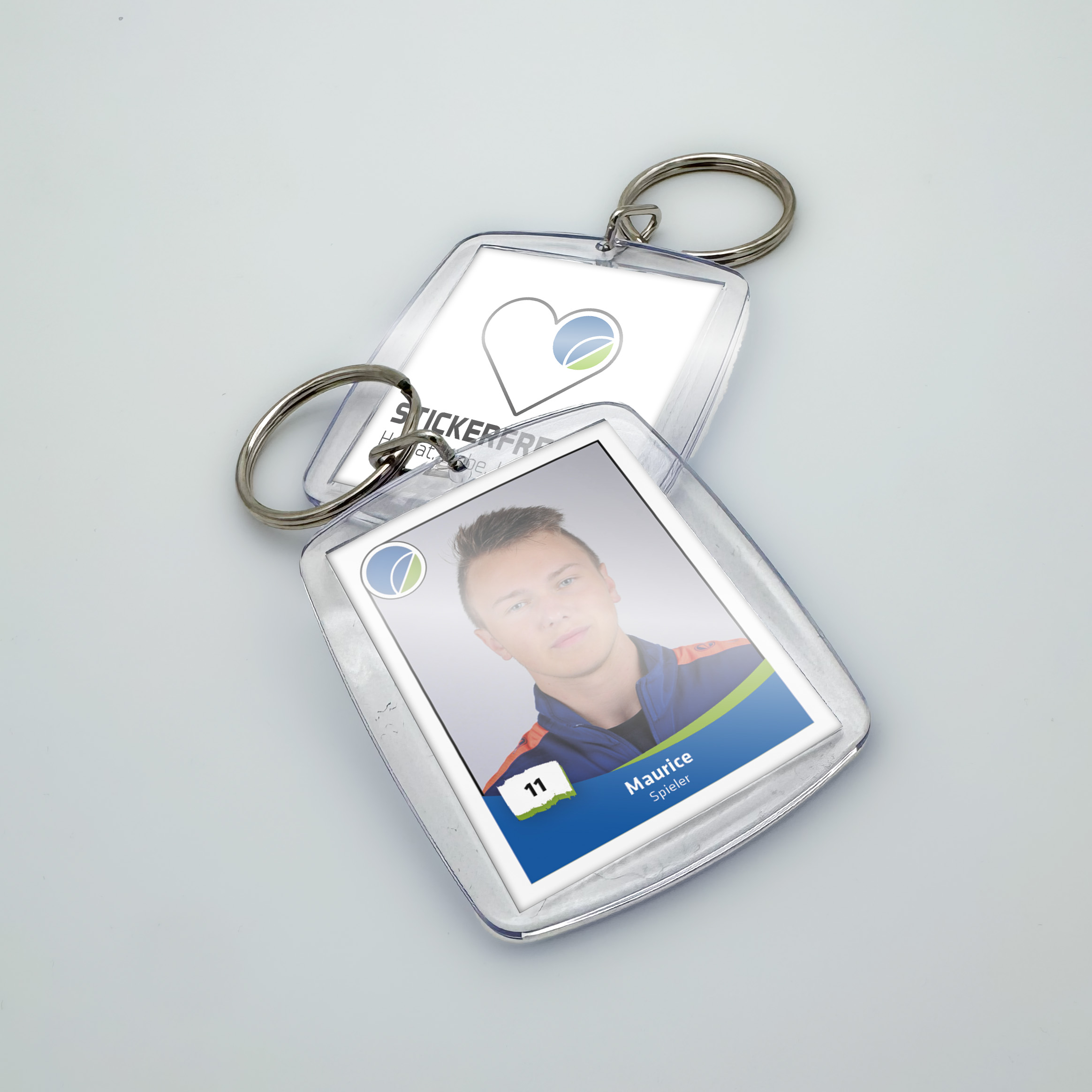 Individueller Acryl-Schlüsselanhänger mit deinem Sammelsticker-Motiv auf der Vorderseite und dem Vereinslogo auf der Rückseite – ideal für Fans und Sammler.