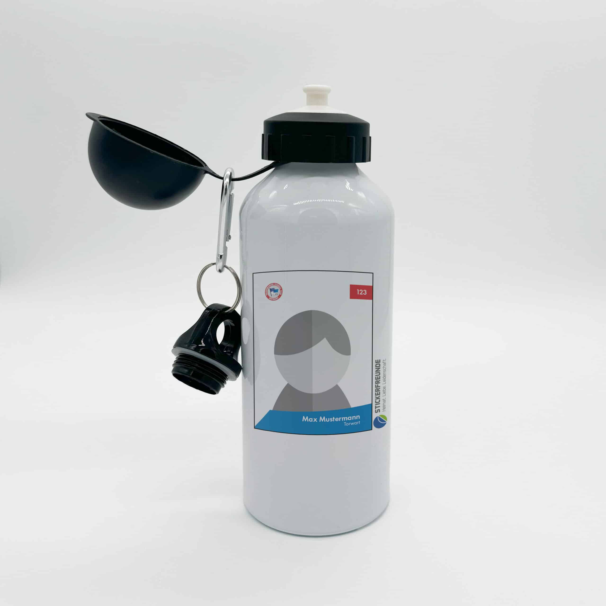Aluminium-Trinkflasche, Mundstück mit Deckel, Schraubverschluss mit Karabiner, 0,6 l, weiß